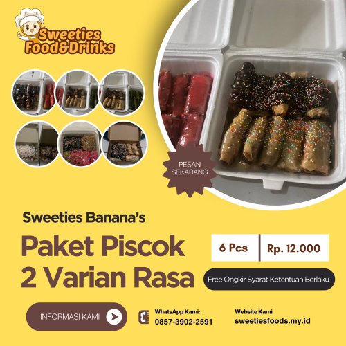 Nikmati manisnya Sweeties Banana’s Paket Piscok dengan 1 varian rasa pilihan favoritmu. Dibuat dari pisang lembut, balutan kulit renyah, dan topping lumer yang menggoda. Hadir dalam 14 pcs dengan harga hemat hanya Rp25.000.